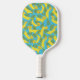 This personalized pickleball paddle (say that three times fast!) is bananas. On the front is an illustration of a cute dachshund style dog made out of yellow bananas. There's a spot to add a name below the graphic. On the reverse side is a coordinating pattern of bananas dogs along with some green tropical palm leaves against a bright blue background.