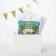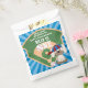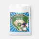 This cute First Birthday favour bag design features an adorable puppy dog wearing a baseball hat and ready to play ball. The background is a baseball field with a blue starburst design.