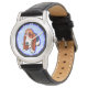 This is a cute watch for anyone who loves those adorable basset hounds! It features a cartoon image of a brown, white, and black basset hound dog, complete with sad eyes and droopy, long ears. The image is placed on a two toned blue background, encircled by a blue ring. The white numbers are customizable, so if you'd prefer to delete them, you may do so by clearing out the field.