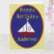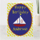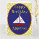 Cette carte d'anniversaire gaie et éclatante a un voilier rouge avec un drapeau jaune. Les voiles blanches servent de modèle pour l'âge de l'enfant. Si l'enfant est âgé de moins de 10 ans, vous devez laisser la première voile sans numéro. Joyeux anniversaire est au-dessus du mignon bateau et le nom de l'enfant est ci-dessous. Le bateau et le texte sont encadrés dans un beau bleu marine clair. L'oeuvre est rétrogradée avec un chèque jaune vif contre blanc. À l'intérieur de la carte, il y a une ancre de cale, une mouette et des drapeaux nautiques. Voici le message d'accueil : Nous vous souhaitons le futur le plus heureux et le plus brillant que vous puissiez avoir. Joyeux anniversaire (S'IL VOUS PLAÎT CHANGER LE NOM DE VOTRE ENFANT), vous extraordinaire, garçon charmant (peut être changé en fille). Voici d’autres aventures à vivre ! Il y a un modèle en dessous de la salutation pour votre nom. Il y a un autre bateau à l'arrière, avec des modèles supplémentaires à personnaliser.
