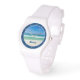 A beautiful beach photograph taken in the ideal vacation destination of Destin, Florida. The gorgeous green waters of Sandestin wash up to the sandy seashore underneath serene blue skies to make the perfect scenic vacation photo wristwatch. Customize this pretty, tropical watch with your name.