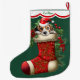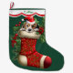 This Holiday stocking has an image of an adorable brown and white Beagle puppy peeking out of an ornate red stocking. The image is surrounded by holly, red berries, and poinsettia blooms, and is placed on a Christmas green background. A white scalloped edge design bordered in red holds your customized name at the top. The back of the stocking is identical to the front.