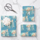 Wrapping paper sheets with an adorable illustration. A cozy bear with stars and sparkles in its fur. Standing beside a Christmas tree. Pastel blue-green colour. Whimsical and cute.