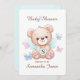 Celebrate the mom-to-be with a cute bear and butterflies baby shower invitation. The front has the special event name along with the name of the mom-to-be as well as her monogram. Details of the baby shower event is on the back of the invitation. There is also a QR code that can be used for RSVP responses (or even a baby shower registry if only one web address is needed). The back also has light blue as the focal colour. Bear & Butterflies design. Use the template to personalize.