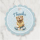 Celebrate your child's birthday with this cute bear thank you tag. The design features a young bear wearing a party hat, throwing confetti into the air. The background is a subtle light blue pattern. Text reads "Thanks"