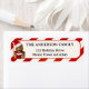 Christmas return address label featuring a cute teddy bear with a bag of gifts and Santa hat on an elegant red ivory background