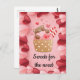 An adorable Valentine postcard with a sweet teddy bear hugging a yummy cupcake. There are hearts all around him, with a romantic pattern of red and pink hearts around the edge of the card. The romantic message reading 'Sweets for the sweet' can be personalized to suit if wished.