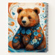 A very cute brown bear, decorated with coloured concentric circles, is surrounded by colourful swirls and swooshes on this adorable "back to school" notebook for a child.