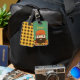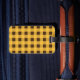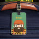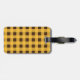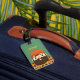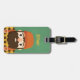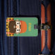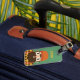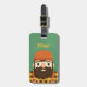 A luggage tag with a cute illustration of a lumberjack with orange beanie hat, a large full beard, orange suspenders and a yellow and brown plaid pattern shirt. Personalize with child's name on hat.