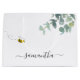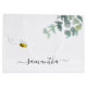 A chic white background. Decorated with watercolored eucalyptus greenery, foliage and a cute, happy smiling bee. Personalize and add a name. The name is written with a modern hand lettered style script with swashes.