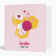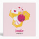 Personalized binder with a sweet image of a pink and white striped bumble bee. A piece of yellow honeycomb behind. A letter sealed with a heart and a group of floating hearts are also part of the design.