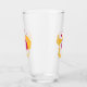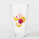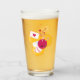 A pint glass with an image of a pink and white striped bumble bee. A piece of yellow honeycomb behind. A letter sealed with a heart and a group of floating hearts are also part of the design.