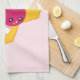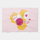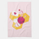 Kitchen towel with a sweet image of a pink and white striped bumble bee. A piece of yellow honeycomb behind. A letter sealed with a heart and a group of floating hearts are also part of the design.