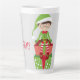 Bespeckled elf in green suit on a stack of Christmas presents. Grey background with customizable text in handwritten font