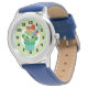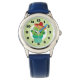 A watch with a cute illustration of a green cactus sitting in a flower pot. Big kawaii eyes and wearing a red sombrero. The background is a pattern with lime green swirls.