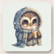Cork coasters with a kawaii illustration of a big-eyed owl in a winter robe and scarf holding a hot coffee.