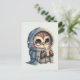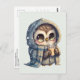 Postcard with a kawaii illustration of a big-eyed owl in a winter robe and scarf holding a hot coffee.