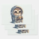 Wrapping paper sheets with a kawaii illustration of a big-eyed owl in a winter robe and scarf holding a hot coffee.