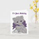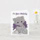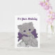 Sweet picture of a grey kitten in a big purple bow, is featured on this Birthday greeting card. Front of card reads, "It's Your Birthday" and inside reads, "Wishing you a Purrfect day. Happy birthday". A cute card to send a female on her special day!