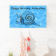 This cloth banner is a mix of light and dark blues with a cute cartoon smiling snail with white eyes an a blue patterned body and shell. Customize the Happy Birthday text and name with the template.