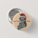 The cute brown and black mixed breed puppy on this cool holiday button is wearing a red Christmas hat with a sprig of holly and berries pinned to it. I He's waiting for Santa Claus to fill his red and green stripy Christmas stocking with lots of gifts and other doggy goodies. This is a customizable button, you can personalize it with your own text. This original puppy illustration makes a great Christmas button/badge and is cool gift for anyone who loves cute puppies, perhaps you just want to treat yourself to this colourful seasonal holiday button. The original puppy illustration is painted in watercolor, he partners well with the grey tabby kitten who's stealing cream from the Christmas pudding.