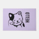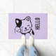 A doormat designed with an illustration of a smiling and waving kitty cat with a black spot around his ear. Purple polka dot background. Simple cute and adorable.