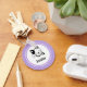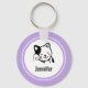 A personalized keychain designed with an illustration of a smiling and waving kitty cat with a black spot around his ear. Purple polka dot background. Simple cute and adorable.