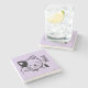 A stone coaster with the word hello and designed with an illustration of a smiling and waving kitty cat with a black spot around his ear. Purple polka dot background. Simple cute and adorable.