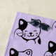 A patterned beach towel designed with an illustration of a smiling and waving kitty cat with a black spot around his ear. Purple background. Simple cute and adorable.