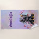 This magical and enchanting custom beach towel features a cute black baby unicorn. The sweet little unicorn is sitting on a rose gold glitter cloud and several pink foil hearts are floating beside her. The background features a rainbow opal pattern. A sample name is printed at the top which you can personalize to include your own custom name or text.