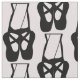 Fabric with a black illustration of a ballet dancers slippers and her legs. Ballerina is standing on her toes, en pointe. Light pink background.