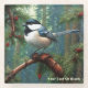 A cute black-capped chickadee (Poecile atricapillus) sits on a conifer branch in a slightly misty forest. Customize by adding your own text.