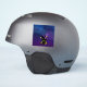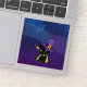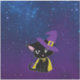 A charming kawaii-style black cat wearing a purple witch hat and yellow cape sits against a starry night sky. Perfect for Halloween decorations, greeting cards, or magical-themed products.