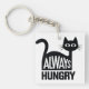 Stylized black cat with exaggerated features, including large eyes and pointy ears. The cat's body has an abstract, curvy shape, and it is positioned in a way that suggests it is playful or curious. Below the cat, the words "ALWAYS HUNGRY" are displayed prominently in bold white letters. The overall design is simple yet striking, combining a whimsical representation of a cat with a humourous message about its appetite. The background is plain white, emphasizing the black silhouette of the cat and the text.