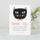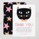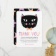 This cute thank you card features a hand drawn black cat, with pastel pink and peach accents. Modern text reads, "THANK YOU" in pastel purple, peach, and pink. Text templates are included for easy personalization. Perfect for sending out after a cat or Halloween themed birthday party!