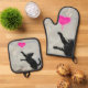 Cute Black Cat Playing with A Pink Heart Oven Mitt & Pot Holder Set