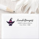 Address labels with a fun Halloween themed illustration for cat lovers. A big-eyed black cat wearing a large black witch's hat with a purplish pink belt around the brim.