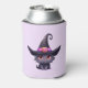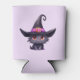 A can cooler with a fun Halloween themed illustration for cat lovers. A big-eyed black cat wearing a large black witch's hat with a purplish pink belt around the brim.