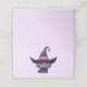 A place card with a fun Halloween themed illustration for cat lovers. A big-eyed black cat wearing a large black witch's hat with a purplish pink belt around the brim.
