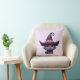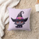 Pillow with a fun Halloween themed illustration for cat lovers. A big-eyed black cat wearing a large black witch's hat with a purplish pink belt around the brim.