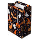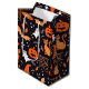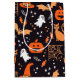 seamless pattern of Halloween illustrated cartoon on a black background. The cartoon characters include pumpkins, ghosts, bats, candy, spider webs, and stars. The icons are all drawn in a simple, cartoony style. The pattern is repeated seamlessly, so it can be used to fill a large area, such as a wall, fabric or a piece of paper. this pattern is good for party hats, wrapping papers, wrapping bags and more. Try this halloween gift bag, you won't regret it.