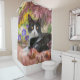Cute cat, tuxedo pattern black and white bicolor, European Shorthair, resting under a Japanese Maple in a flowery garden and looking curiously. Photo taken by Katho Menden. This shower curtain is a gift idea for cat lovers.