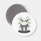 A magnet with an illustration of a black and white panda bear sitting in some green watercolor bamboo. A little speech bubble with a heart inside. Cute design with a panda expressing his love.