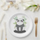 Paper plates with an illustration of a black and white panda bear sitting in some green watercolor bamboo. A little speech bubble with a heart inside. Cute design with a panda expressing his love.
