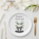 Paper plates with an illustration of a black and white panda bear sitting in some green watercolor bamboo. A little speech bubble with a heart inside. Cute design with a panda expressing his love.