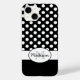 Personalize retro trendy girly iPhone case with your initial and name. Adorable Cool retro pattern with White dots and black background.