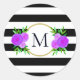 Cute Black White Striped Purple Floral Monogram Classic Round Sticker