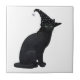 A cute black cat sits contently wearing a star and moon adorned black witches hat.