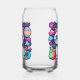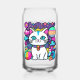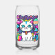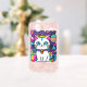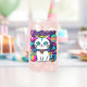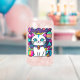 Verre adorable avec un chaton kitty mignon, fantaisiste et blanc avec de grands yeux bleus, des oreilles roses et portant un collier coloré. Elle a une jolie queue rayée bleue, rose et blanche et une bande bleue sur la tête. L'arrière - plan est principalement violet avec des planètes, des nuages, des étoiles et des fleurs dans un mélange de couleurs audacieuses, vives et vives. Idéal pour tous ceux qui aiment les chats et l'espace.