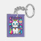 Adorable porte - clé avec un mignon chat kitty caricaturé blanc, fantaisiste, avec de grands yeux bleus, des oreilles roses et portant un collier brillant et coloré. Elle a une jolie queue rayée bleue, rose et blanche et une bande bleue sur la tête. L'arrière - plan est principalement violet avec des planètes, des nuages, des étoiles et des fleurs dans un mélange de couleurs audacieuses, vives et vives. Idéal pour tous ceux qui aiment les chats et l'espace.